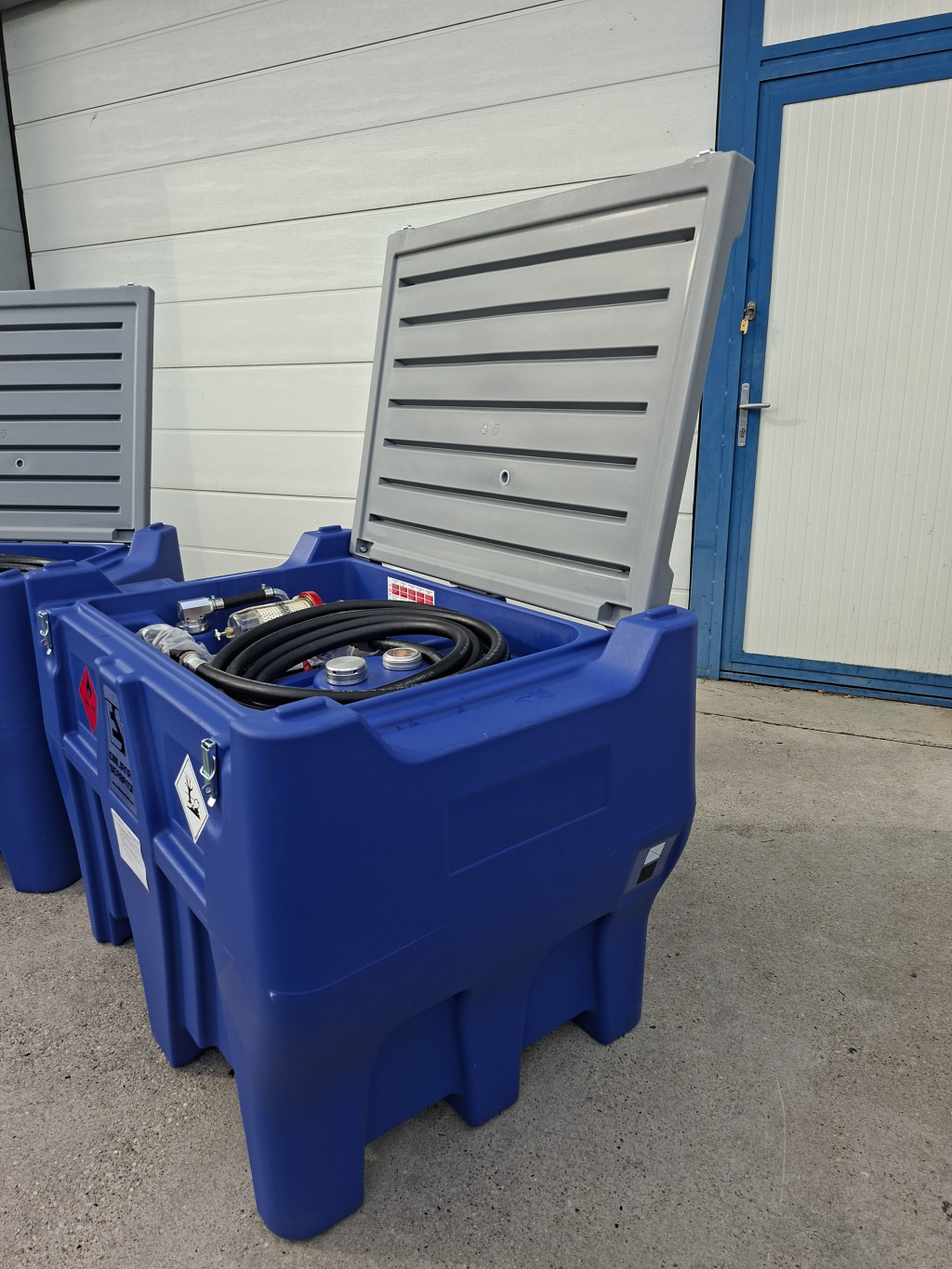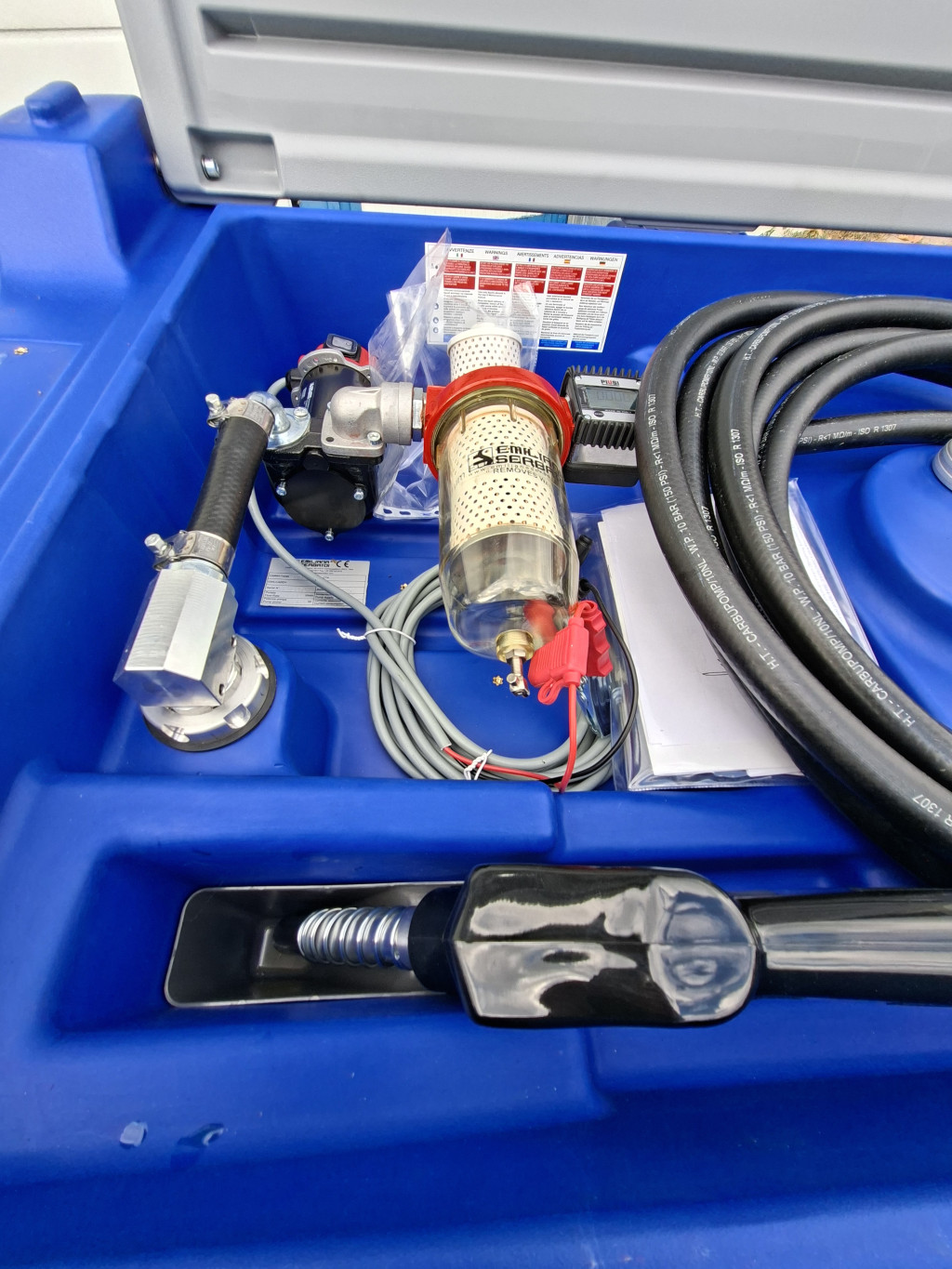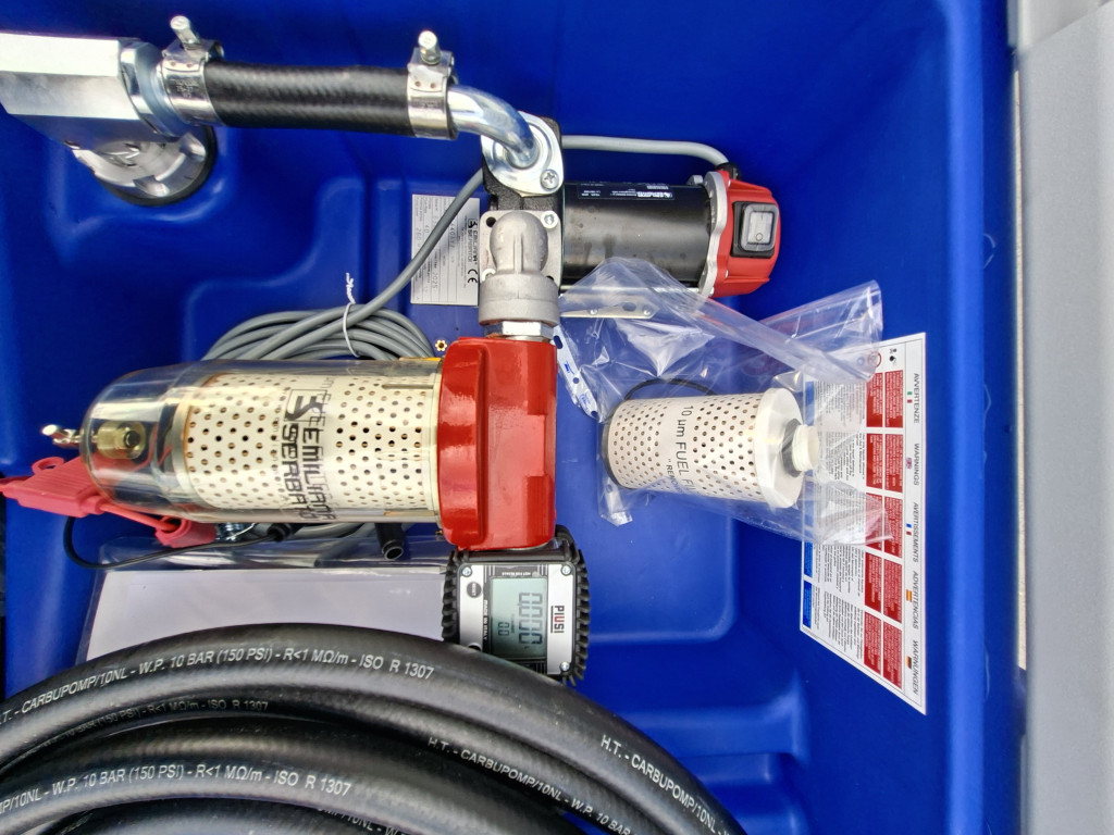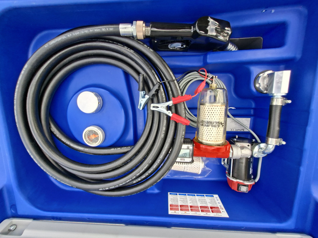 CARRYTANK 440 literes PICKUP gázolajtartály *kék-szürke* 12V 40 l/perc szivattyú, 6m elektr. kábel, 8m nyomótömlő, automata pisztoly, K24 digitális mérőóra, 10 µ víz- és szennyleválasztó szűrőkészlet +1 db ajándék tartalékszűrő