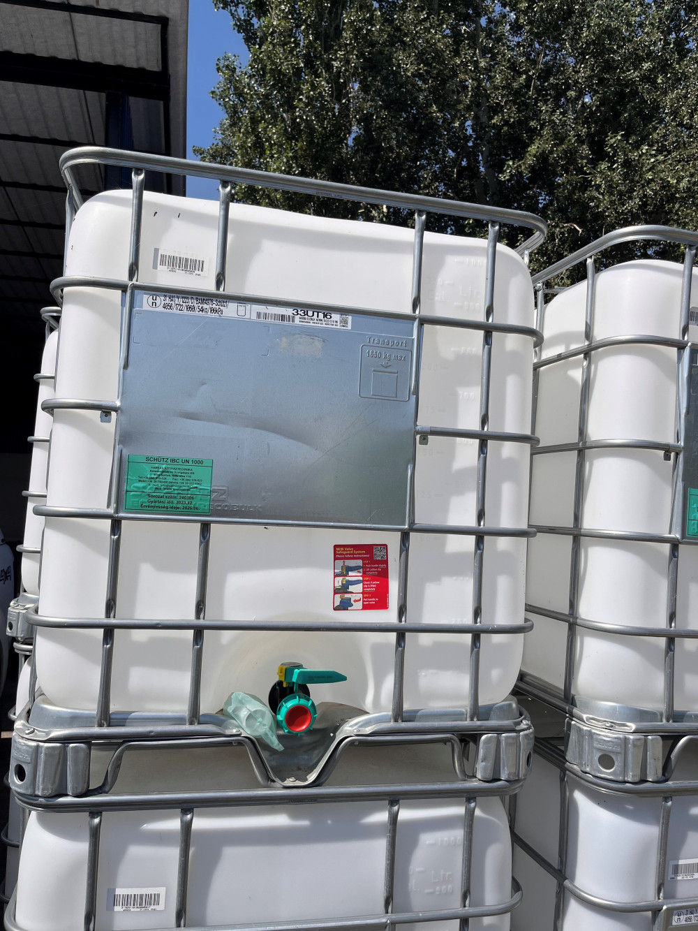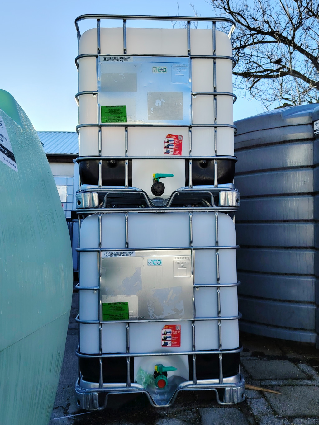 HASZNÁLT RECO UN 1000 literes, ADR-ES műanyag IBC tartály fix műanyag csappal, DN150-es fedéllel. ADR kb. fél évesek.