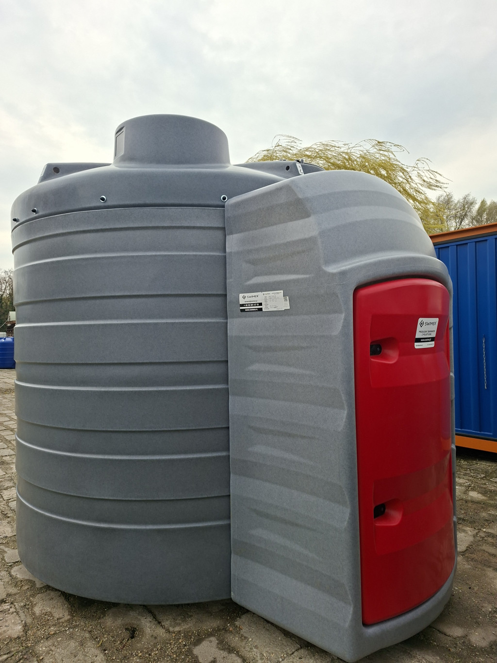 Műanyag dupla falú gázolajtartály két ponton zárható kimérőszekrénnyel. A tartályok rotációs eljárással kerülnek gyártásra, mely biztosítja az egyenletes öntést (nincs hegesztés, illesztés) és a külső tényezőkkel szembeni nagy ellenállást. UV-állóak, nem fakulnak, nem korrodálnak, magas kémiai és mechanikai ellenálló képességgel rendelkeznek.